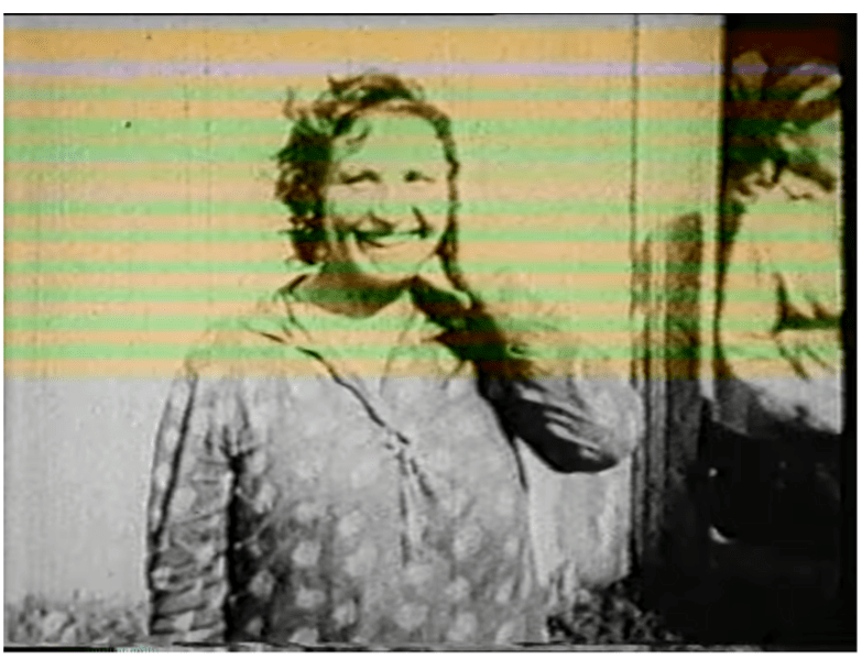 About 3 mins 39 seconds in, the camera stops and focuses on the face of a smiling young woman, pictured in the screenshot below. The Russian voice over says ‘Crazy Rivka, everybody knows her. She smiles at every passerby very kindly.’